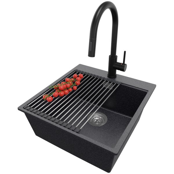 PRIMAGRAN Granitspüle Anthrazit 48x50cm, Spülbecken 1 Becken + Küchenarmatur 40x20cm + Ablauf-Set + Aufrollbare Abtropffläche, Küchenspüle ab 50er Unterschrank - Oslo