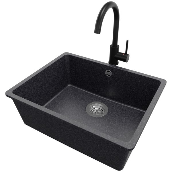 PRIMAGRAN Granitspüle Anthrazit 56x44cm, Spülbecken 1 Becken + Küchenarmatur 32x20cm + Ablauf-Set, Küchenspüle ab 60er Unterschrank - Venedig Slim Easy