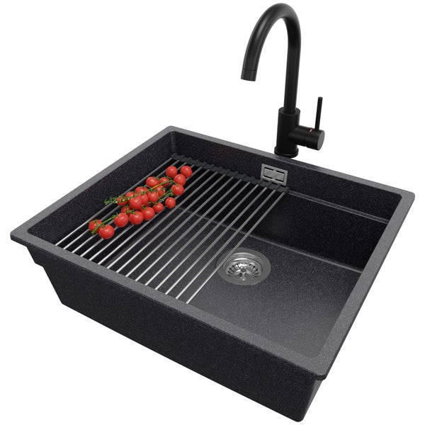 PRIMAGRAN Granitspüle Anthrazit 56x47cm, Spülbecken 1 Becken + Küchenarmatur 32x20cm + Ablauf-Set + Aufrollbare Abtropffläche, Küchenspüle ab 60er Unterschrank - Praga Slim