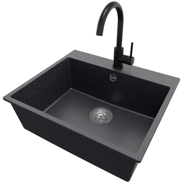 PRIMAGRAN Granitspüle Anthrazit 58x50cm, Spülbecken 1 Becken + Küchenarmatur 32x20cm + Ablauf-Set, Küchenspüle ab 60er Unterschrank - Riga