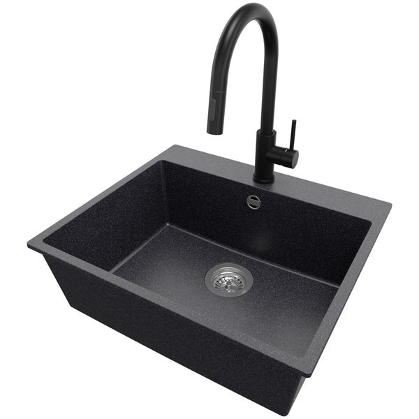 PRIMAGRAN Granitspüle Anthrazit 58x50cm, Spülbecken 1 Becken + Küchenarmatur 40x20cm + Ablauf-Set, Küchenspüle ab 60er Unterschrank - Riga