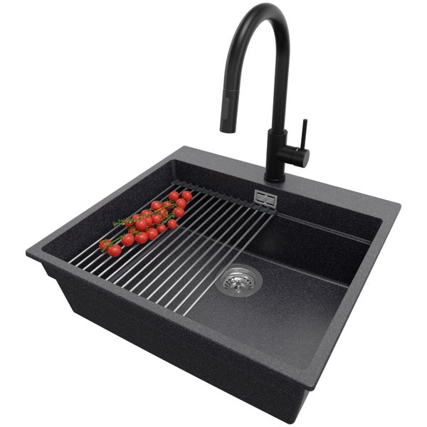 PRIMAGRAN Granitspüle Anthrazit 58x53cm, Spülbecken 1 Becken + Küchenarmatur 40x20cm + Ablauf-Set + Aufrollbare Abtropffläche, Küchenspüle ab 60er Unterschrank - Oslo Max