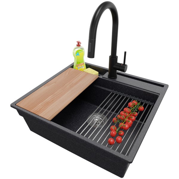 PRIMAGRAN Granitspüle Anthrazit 58x53cm, Spülbecken 1 Becken + Küchenarmatur 40x20cm + Ablauf-Set + Küchenzubehörset, Küchenspüle ab 60er Unterschrank - Oslo Pocket