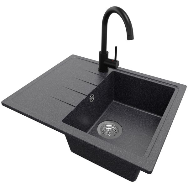 PRIMAGRAN Granitspüle Anthrazit 62x50cm, Spülbecken 1 Becken + Küchenarmatur 32x20cm + Ablauf-Set, Küchenspüle ab 40er Unterschrank - Mailand