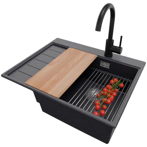 PRIMAGRAN Granitspüle Anthrazit 62x50cm, Spülbecken 1 Becken + Küchenarmatur 32x20cm + Ablauf-Set + Küchenzubehörset, Küchenspüle ab 45er Unterschrank - Sydney