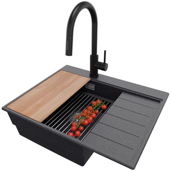 PRIMAGRAN Granitspüle Anthrazit 62x50cm, Spülbecken 1 Becken + Küchenarmatur 40x20cm + Ablauf-Set + Küchenzubehörset, Küchenspüle ab 45er Unterschrank - Sydney