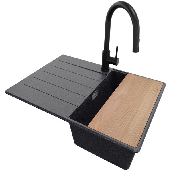PRIMAGRAN Granitspüle Anthrazit 70x50cm, Spülbecken 1 Becken + Küchenarmatur 40x20cm + Ablauf-Set + Schneidebrett, Küchenspüle ab 40er Unterschrank - Kopenhagen