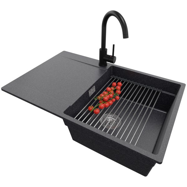PRIMAGRAN Granitspüle Anthrazit 78x50cm, Spülbecken 1 Becken + Küchenarmatur 32x20cm + Ablauf-Set + Aufrollbare Abtropffläche, Küchenspüle ab 50er Unterschrank - San Francisco