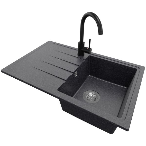PRIMAGRAN Granitspüle Anthrazit 78x50cm, Spülbecken 1 Becken + Küchenarmatur 32x20cm + Ablauf-Set, Küchenspüle ab 45er Unterschrank - Mailand