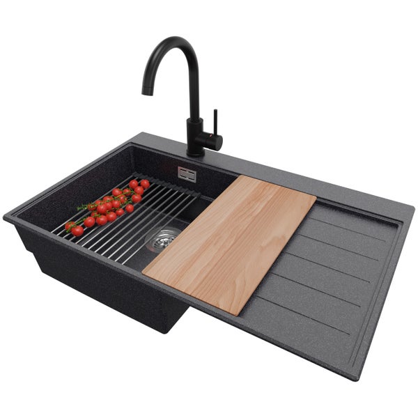 PRIMAGRAN Granitspüle Anthrazit 78x50cm, Spülbecken 1 Becken + Küchenarmatur 32x20cm + Ablauf-Set + Küchenzubehörset, Küchenspüle ab 45er Unterschrank - Sydney