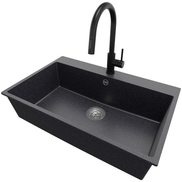 PRIMAGRAN Granitspüle Anthrazit 78x50cm, Spülbecken 1 Becken + Küchenarmatur 40x20cm + Ablauf-Set, Küchenspüle ab 80er Unterschrank - Riga
