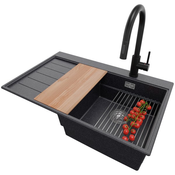 PRIMAGRAN Granitspüle Anthrazit 78x50cm, Spülbecken 1 Becken + Küchenarmatur 40x20cm + Ablauf-Set + Küchenzubehörset, Küchenspüle ab 45er Unterschrank - Sydney