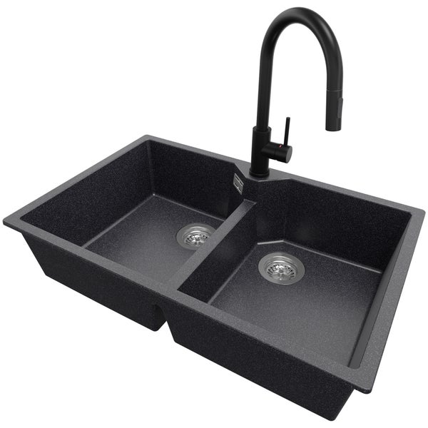 PRIMAGRAN Granitspüle Anthrazit 78x50cm, Spülbecken 2 Becken + Küchenarmatur 40x20cm + Ablauf-Set, Küchenspüle ab 80er Unterschrank - Madrid Twin