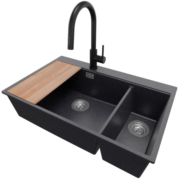 PRIMAGRAN Granitspüle Anthrazit 78x50cm, Spülbecken 2 Becken + Küchenarmatur 40x20cm + Ablauf-Set + Schneidebrett, Küchenspüle ab 80er Unterschrank - Oslo Duo