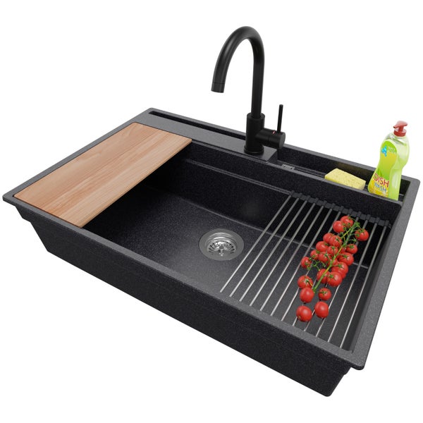 PRIMAGRAN Granitspüle Anthrazit 78x53cm, Spülbecken 1 Becken + Küchenarmatur 32x20cm + Ablauf-Set + Küchenzubehörset, Küchenspüle ab 80er Unterschrank - Oslo Pocket