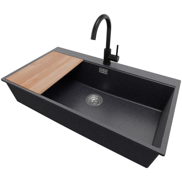 PRIMAGRAN Granitspüle Anthrazit 88x50cm, Spülbecken 1 Becken + Küchenarmatur 32x20cm + Ablauf-Set + Schneidebrett, Küchenspüle ab 90er Unterschrank - Oslo