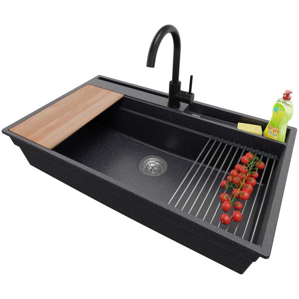 PRIMAGRAN Granitspüle Anthrazit 88x53cm, Spülbecken 1 Becken + Küchenarmatur 32x20cm + Ablauf-Set + Küchenzubehörset, Küchenspüle ab 90er Unterschrank - Oslo Pocket