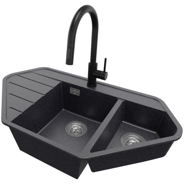 PRIMAGRAN Granitspüle Anthrazit 90x50cm, Eckspüle 1,5 Becken + Küchenarmatur 40x20cm + Ablauf-Set, Küchenspüle ab 80er Unterschrank - Kopenhagen Corner