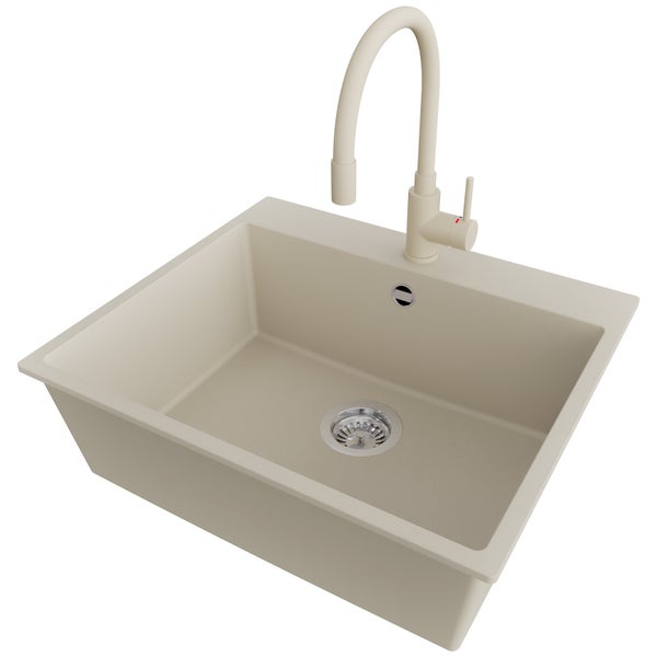PRIMAGRAN Granitspüle Beige 58x50cm, Spülbecken 1 Becken + Küchenarmatur 38x14cm + Ablauf-Set, Küchenspüle ab 60er Unterschrank - Riga