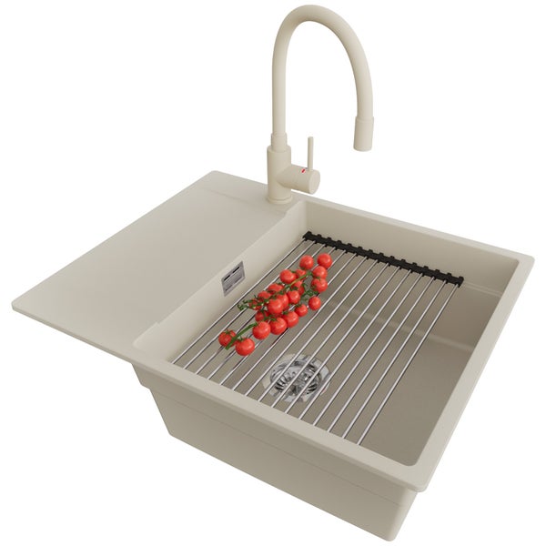 PRIMAGRAN Granitspüle Beige 62x50cm, Spülbecken 1 Becken + Küchenarmatur 38x14cm + Ablauf-Set + Aufrollbare Abtropffläche, Küchenspüle ab 50er Unterschrank - San Francisco