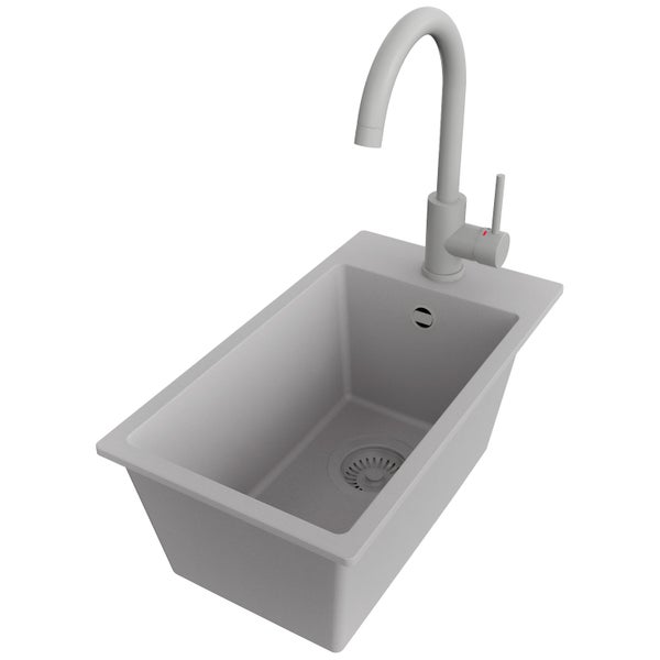 PRIMAGRAN Granitspüle Grau 28x50cm, Spülbecken 1 Becken + Küchenarmatur 32x20cm + Ablauf-Set, Küchenspüle ab 30er Unterschrank - Riga