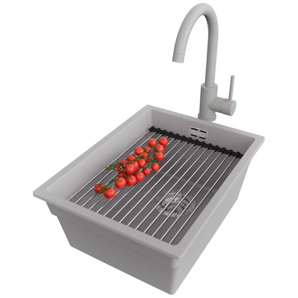 PRIMAGRAN Granitspüle Grau 36x47cm, Spülbecken 1 Becken + Küchenarmatur 32x20cm + Ablauf-Set + Aufrollbare Abtropffläche, Küchenspüle ab 40er Unterschrank - Praga Slim