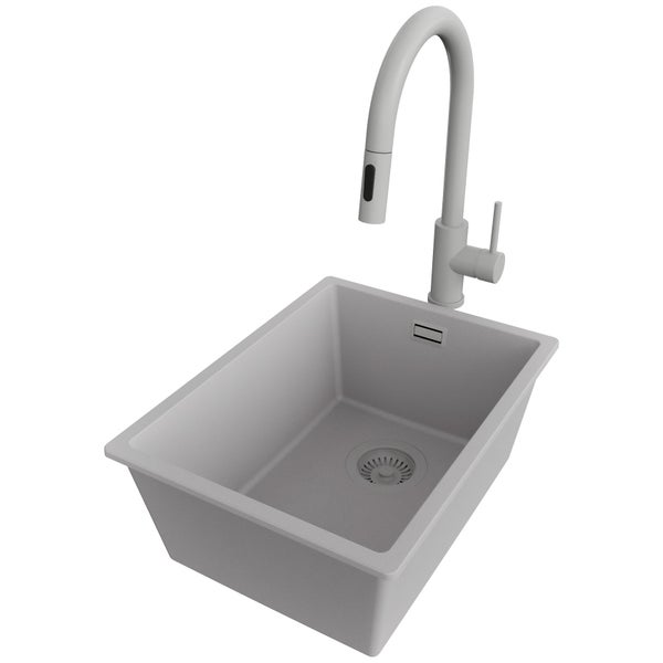 PRIMAGRAN Granitspüle Grau 36x47cm, Spülbecken 1 Becken + Küchenarmatur 40x20cm + Ablauf-Set, Küchenspüle ab 40er Unterschrank - London Slim