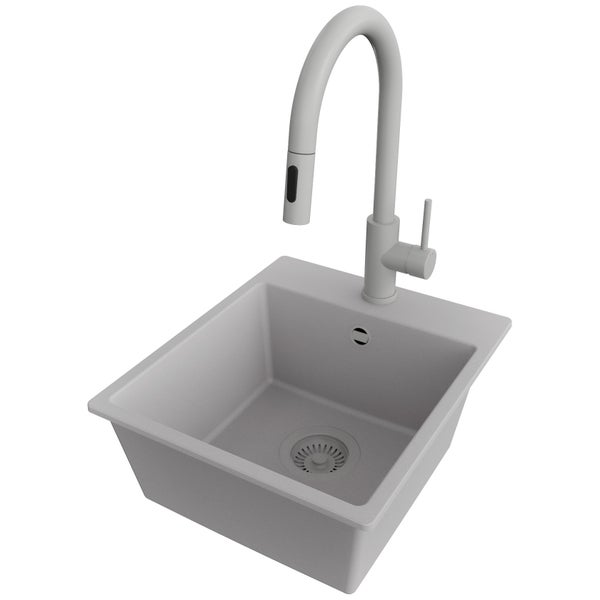 PRIMAGRAN Granitspüle Grau 38x44cm, Spülbecken 1 Becken + Küchenarmatur 40x20cm + Ablauf-Set, Küchenspüle ab 40er Unterschrank - Riga Easy
