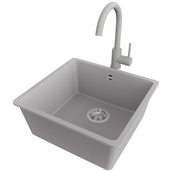 PRIMAGRAN Granitspüle Grau 46x44cm, Spülbecken 1 Becken + Küchenarmatur 32x20cm + Ablauf-Set, Küchenspüle ab 50er Unterschrank - Venedig Slim Easy