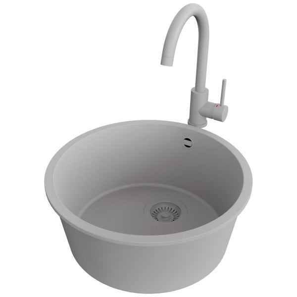 PRIMAGRAN Granitspüle Grau 46x46cm, Spülbecken Rund 1 Becken + Küchenarmatur 32x20cm + Ablauf-Set, Küchenspüle ab 50er Unterschrank - Valletta Slim