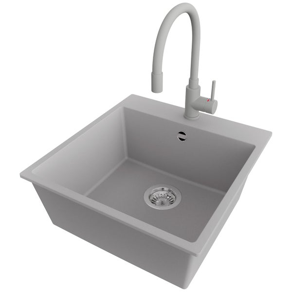 PRIMAGRAN Granitspüle Grau 48x50cm, Spülbecken 1 Becken + Küchenarmatur 38x14cm + Ablauf-Set, Küchenspüle ab 50er Unterschrank - Riga