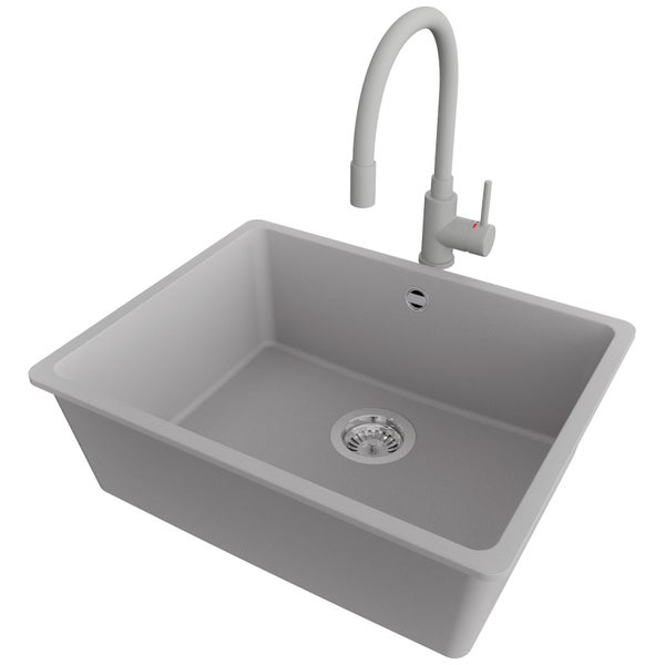 PRIMAGRAN Granitspüle Grau 56x44cm, Spülbecken 1 Becken + Küchenarmatur 38x14cm + Ablauf-Set, Küchenspüle ab 60er Unterschrank - Venedig Slim Easy