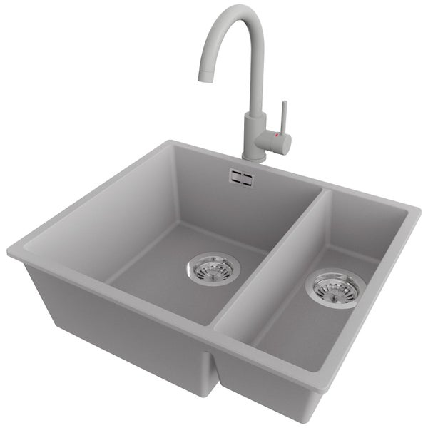 PRIMAGRAN Granitspüle Grau 56x47cm, Spülbecken 1,5 Becken + Küchenarmatur 32x20cm + Ablauf-Set, Küchenspüle ab 60er Unterschrank - London Slim Duo