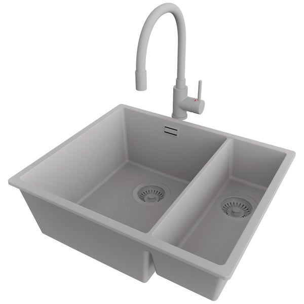 PRIMAGRAN Granitspüle Grau 56x47cm, Spülbecken 1,5 Becken + Küchenarmatur 38x14cm + Ablauf-Set, Küchenspüle ab 60er Unterschrank - London Slim Duo