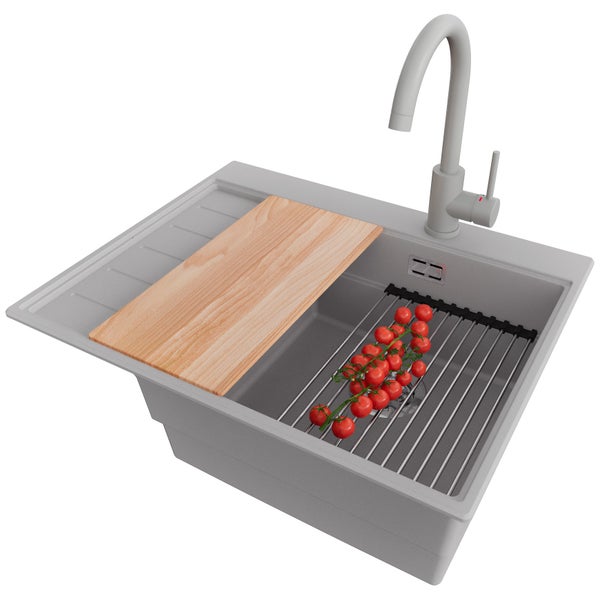PRIMAGRAN Granitspüle Grau 62x50cm, Spülbecken 1 Becken + Küchenarmatur 32x20cm + Ablauf-Set + Küchenzubehörset, Küchenspüle ab 45er Unterschrank - Sydney