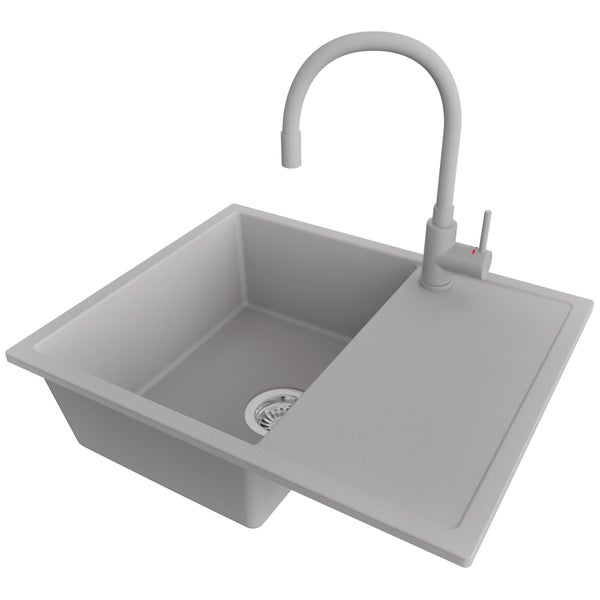 PRIMAGRAN Granitspüle Grau 62x50cm, Spülbecken 1 Becken + Küchenarmatur 38x14cm + Ablauf-Set, Küchenspüle ab 45er Unterschrank - Ibiza