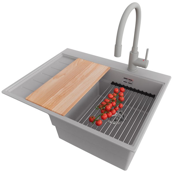 PRIMAGRAN Granitspüle Grau 62x50cm, Spülbecken 1 Becken + Küchenarmatur 38x14cm + Ablauf-Set + Küchenzubehörset, Küchenspüle ab 40er Unterschrank - Sydney