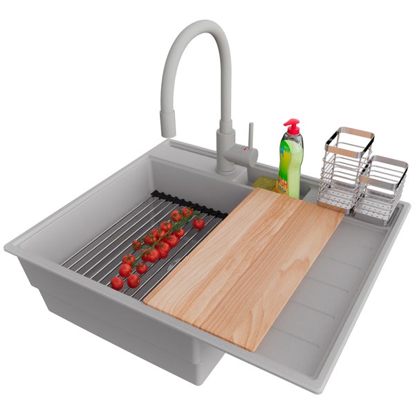 PRIMAGRAN Granitspüle Grau 62x53cm, Spülbecken 1 Becken + Küchenarmatur 38x14cm + Ablauf-Set + Küchenzubehörset, Küchenspüle ab 45er Unterschrank - Sydney Pocket