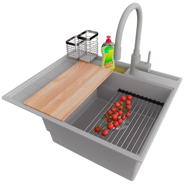 PRIMAGRAN Granitspüle Grau 62x53cm, Spülbecken 1 Becken + Küchenarmatur 38x14cm + Ablauf-Set + Küchenzubehörset, Küchenspüle ab 45er Unterschrank - Sydney Pocket