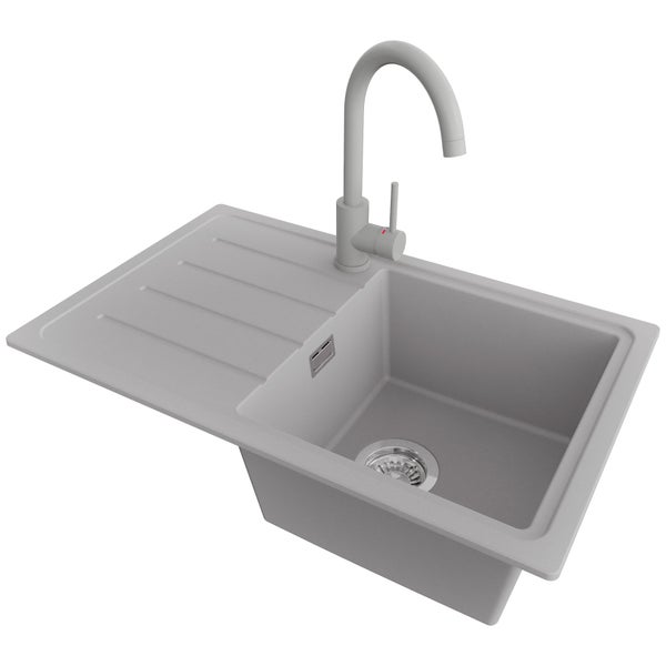 PRIMAGRAN Granitspüle Grau 70x44cm, Spülbecken 1 Becken + Küchenarmatur 32x20cm + Ablauf-Set, Küchenspüle ab 45er Unterschrank - Kopenhagen Easy