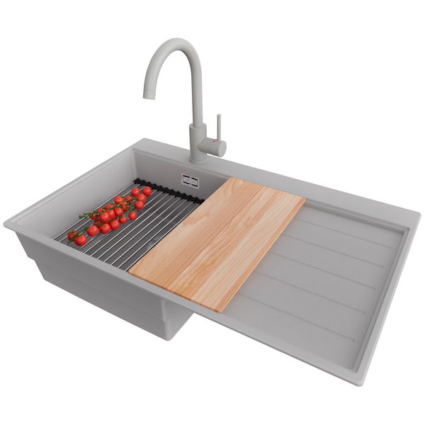 PRIMAGRAN Granitspüle Grau 78x50cm, Spülbecken 1 Becken + Küchenarmatur 32x20cm + Ablauf-Set + Küchenzubehörset, Küchenspüle ab 45er Unterschrank - Sydney