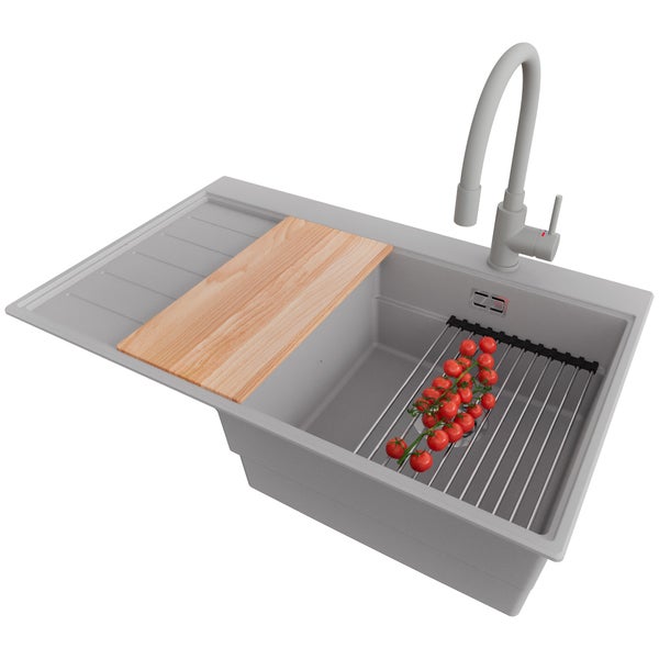 PRIMAGRAN Granitspüle Grau 78x50cm, Spülbecken 1 Becken + Küchenarmatur 38x14cm + Ablauf-Set + Küchenzubehörset, Küchenspüle ab 45er Unterschrank - Sydney