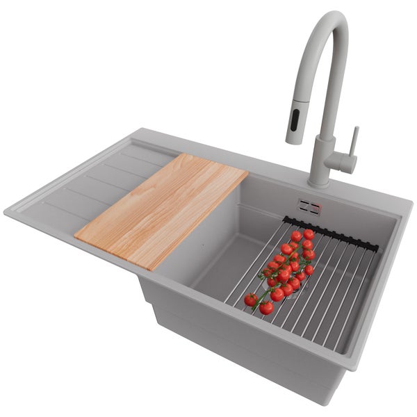 PRIMAGRAN Granitspüle Grau 78x50cm, Spülbecken 1 Becken + Küchenarmatur 40x20cm + Ablauf-Set + Küchenzubehörset, Küchenspüle ab 45er Unterschrank - Sydney