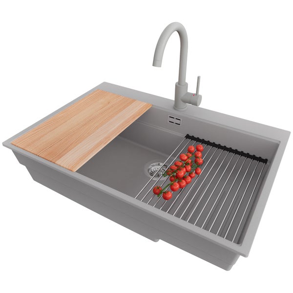 PRIMAGRAN Granitspüle Grau 78x53cm, Spülbecken 1 Becken + Küchenarmatur 32x20cm + Ablauf-Set + Küchenzubehörset, Küchenspüle ab 80er Unterschrank - Oslo Max