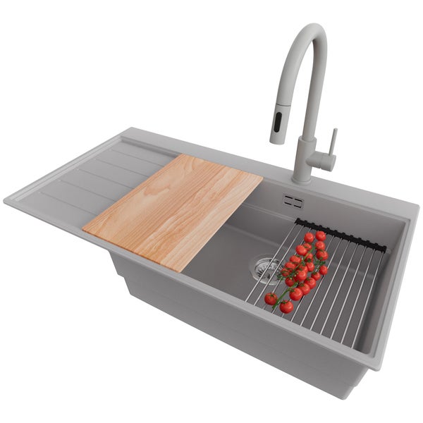 PRIMAGRAN Granitspüle Grau 90x50cm, Spülbecken 1 Becken + Küchenarmatur 40x20cm + Ablauf-Set + Küchenzubehörset, Küchenspüle ab 60er Unterschrank - Sydney