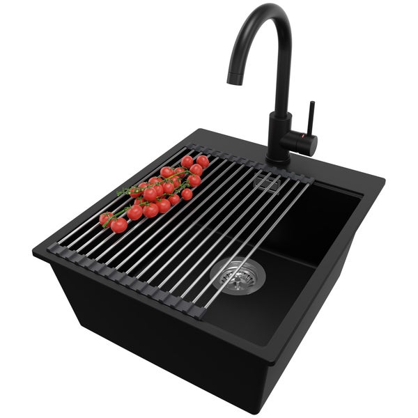 PRIMAGRAN Granitspüle Schwarz 43x50cm, Spülbecken 1 Becken + Küchenarmatur 32x20cm + Ablauf-Set + Aufrollbare Abtropffläche, Küchenspüle ab 45er Unterschrank - Oslo