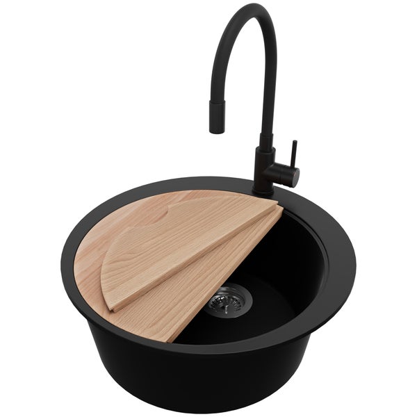 PRIMAGRAN Granitspüle Schwarz 53x53cm, Spülbecken Rund 1 Becken + Küchenarmatur 40x38cm + Ablauf-Set + Schneidebrett, Küchenspüle ab 50er Unterschrank - Pisa Max