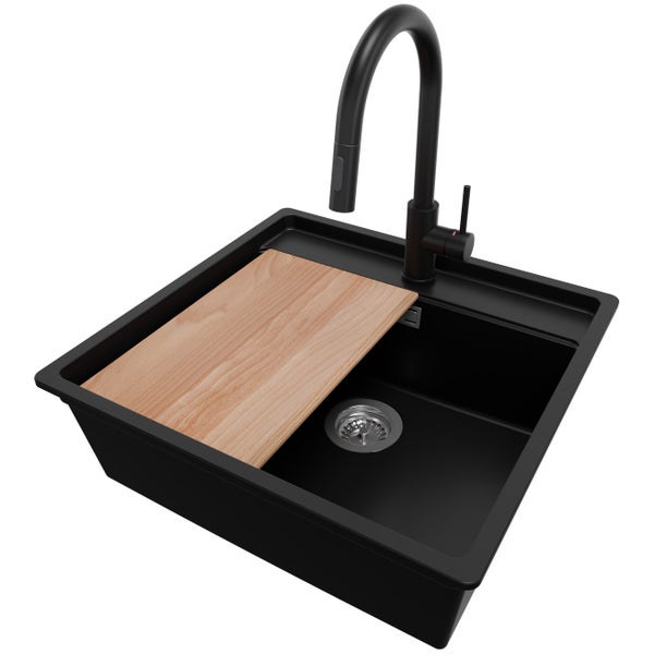 PRIMAGRAN Granitspüle Schwarz 56x53cm, Eckspüle 1 Becken + Küchenarmatur 40x20cm + Ablauf-Set + Schneidebrett, Küchenspüle ab 60er Unterschrank - Bergen