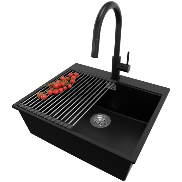 PRIMAGRAN Granitspüle Schwarz 58x50cm, Spülbecken 1 Becken + Küchenarmatur 40x20cm + Ablauf-Set + Aufrollbare Abtropffläche, Küchenspüle ab 60er Unterschrank - Oslo