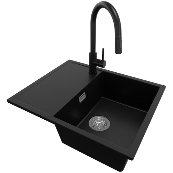 PRIMAGRAN Granitspüle Schwarz 62x50cm, Spülbecken 1 Becken + Küchenarmatur 40x20cm + Ablauf-Set, Küchenspüle ab 45er Unterschrank - Ibiza